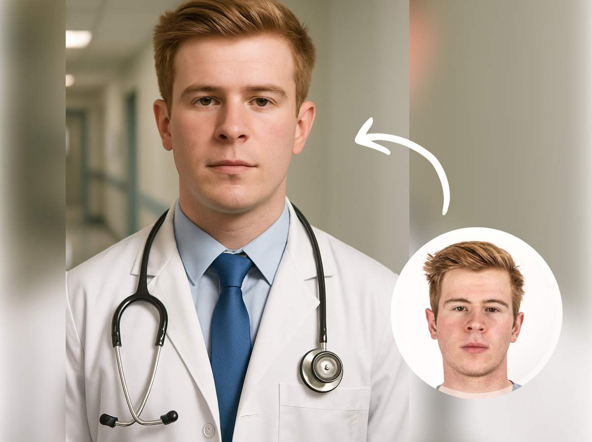 Transform your portrait into a medical-themed headshot featuring lab coats, stethoscopes, and realistic hospital settings that highlight professionalism and healthcare identity.
